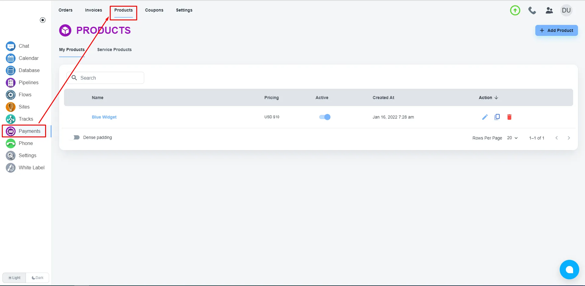 Navigate to the product builder by clicking the “Payments” on the left side menu. Then when you have the database page open you will see a link to “Products” on the top of your page, please click that.