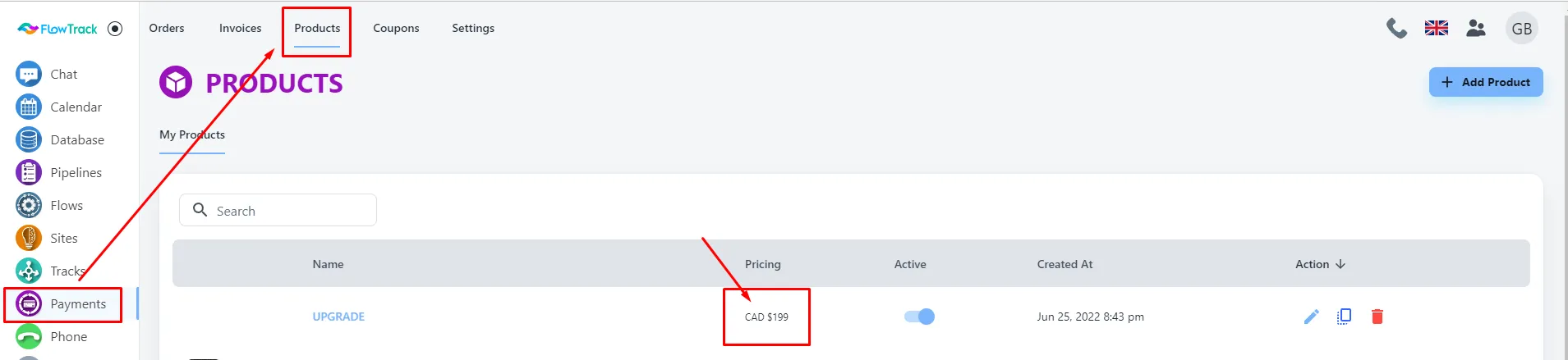 Please, navigate to the ‘Payments’’ on the left menu bar. Once the page is loaded, click on the ‘Products’ on the top menu bar.